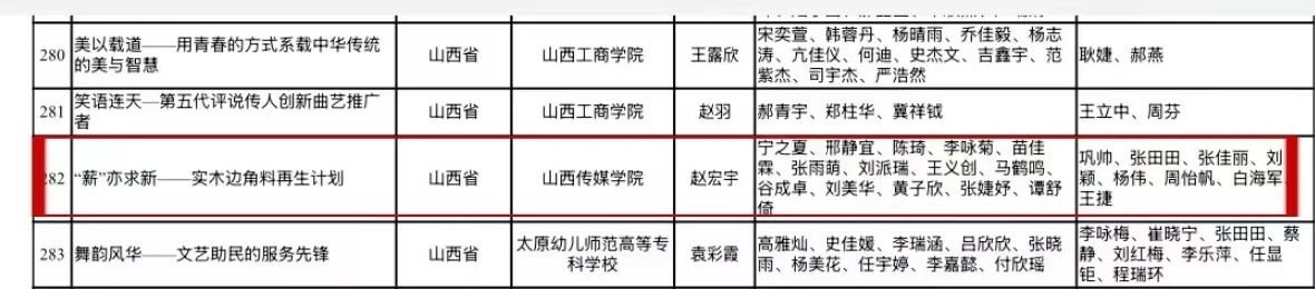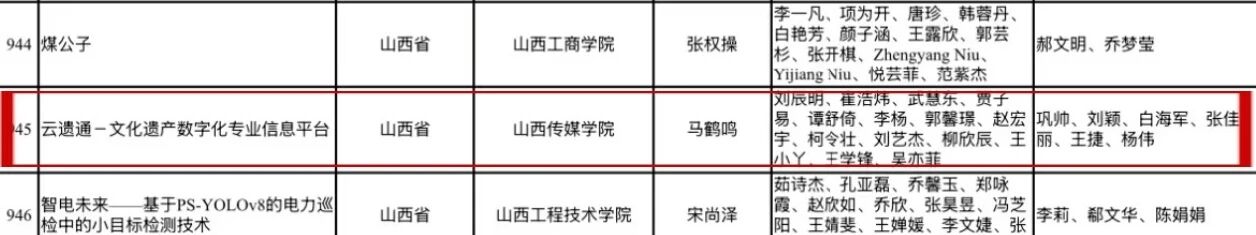 由我院马鹤鸣同学作为负责人,谭舒倚、柯令状、刘艺杰、柳欣辰、王小丫同学作为参与人,合作完成的《云遗通——文化遗产数字化专业信息平台》项目获得中国国际大学生创新大赛(2024)高教主赛道铜奖,我院邢静宜、苗佳霖、马鹤鸣、黄子欣、谭舒倚同学参与的《'薪'亦求新——实木边角料再生计划》项目获得中国国际大学生创新大赛(2024)青年红色筑梦之旅”赛道铜奖。